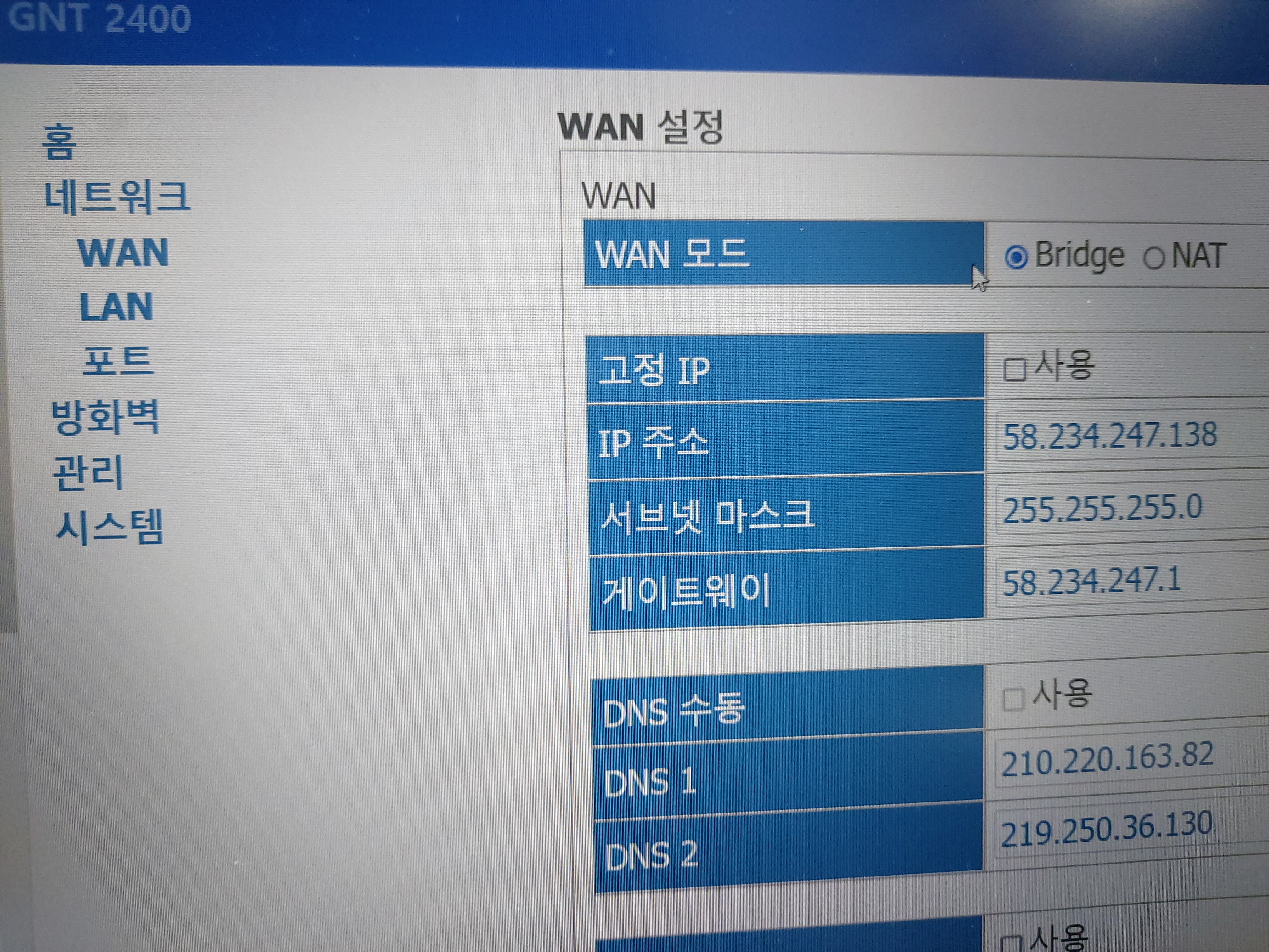 7. 케이블모뎀 웹 관리자 페이지에 접속해서 WAN 모드를 NAT모드에서 Bridge 모드로 변경한다.